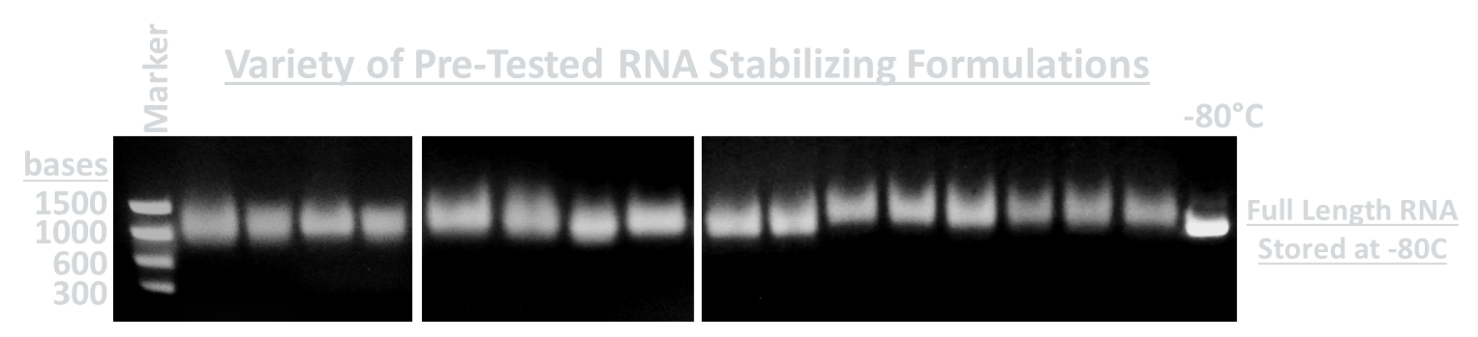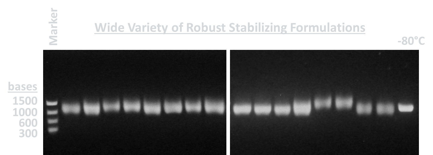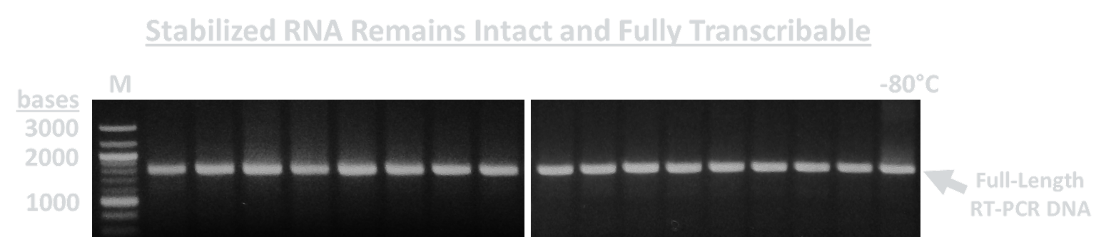 RNA stored in stabilizing solutions for over 1 year at room temperature can be reverse transcribed using RT-PCR to produce full-length double stranded DNA of comparable size to RNA stored at -80°C. Suggesting RNA bases remain intact and unaltered during storage in RNA stabilizing formulations.